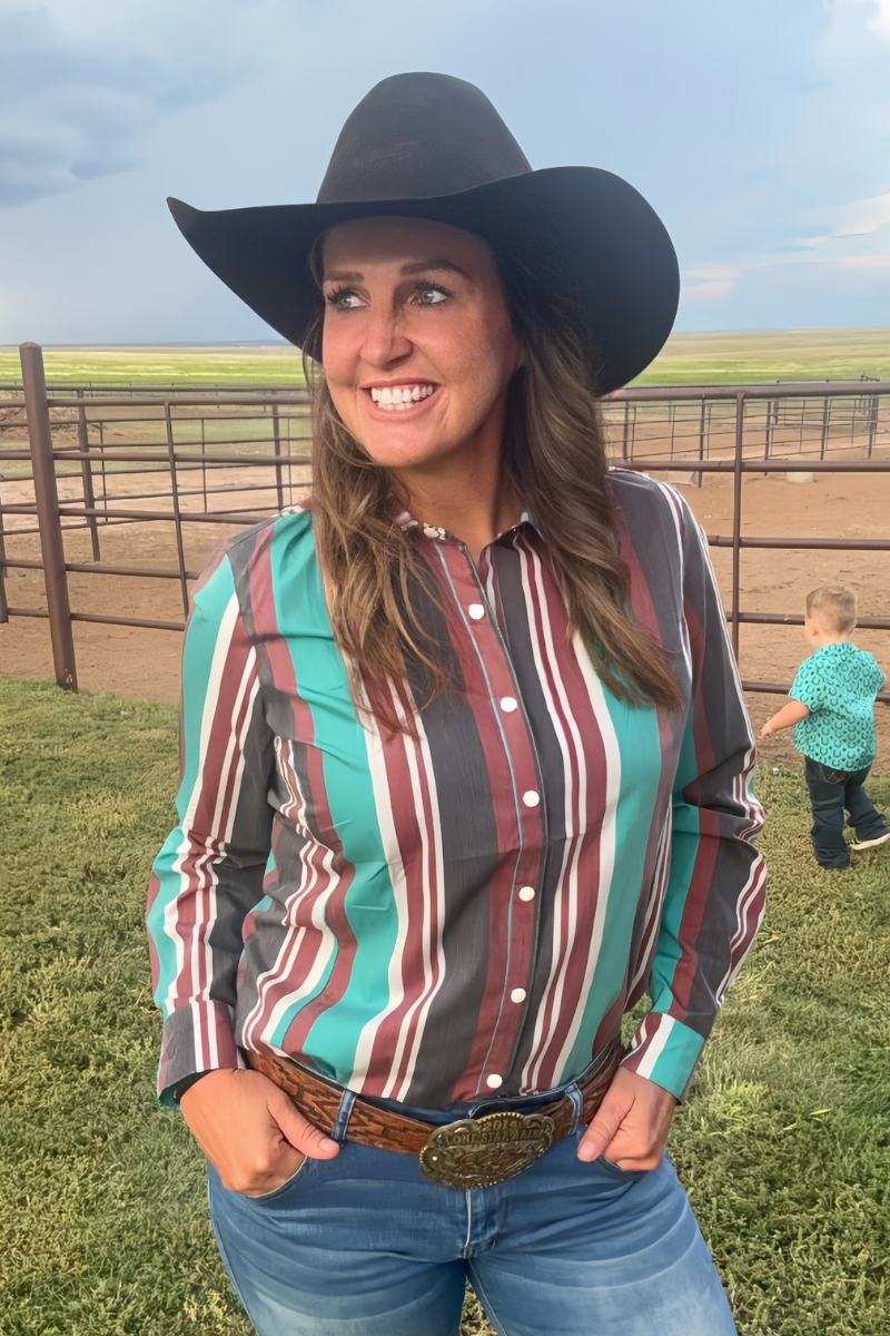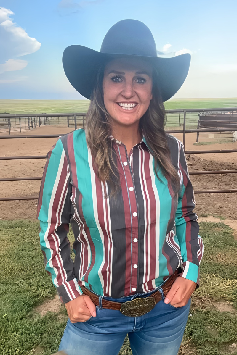 Featuring classic rodeo pearl snaps and bold red, black, and turquoise stripes, this shirt brings playful charm and timeless style together. Perfect for standing out whether you’re out on the town or just feeling a little wild.