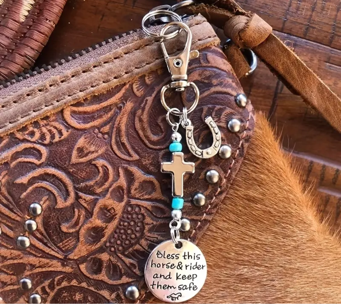 Our Bridle Charm/Key Chain – “Bless This Rider & Keep Them Safe” features a heartfelt mes sage for any rider and is perfect for keychains, bags, or horse tack. A thoughtful gift to remind your rider to stay safe on every ride.